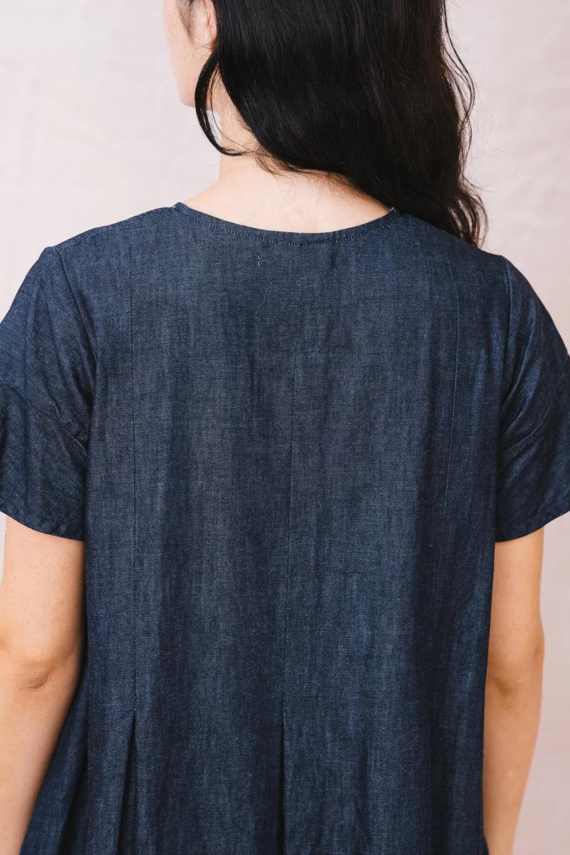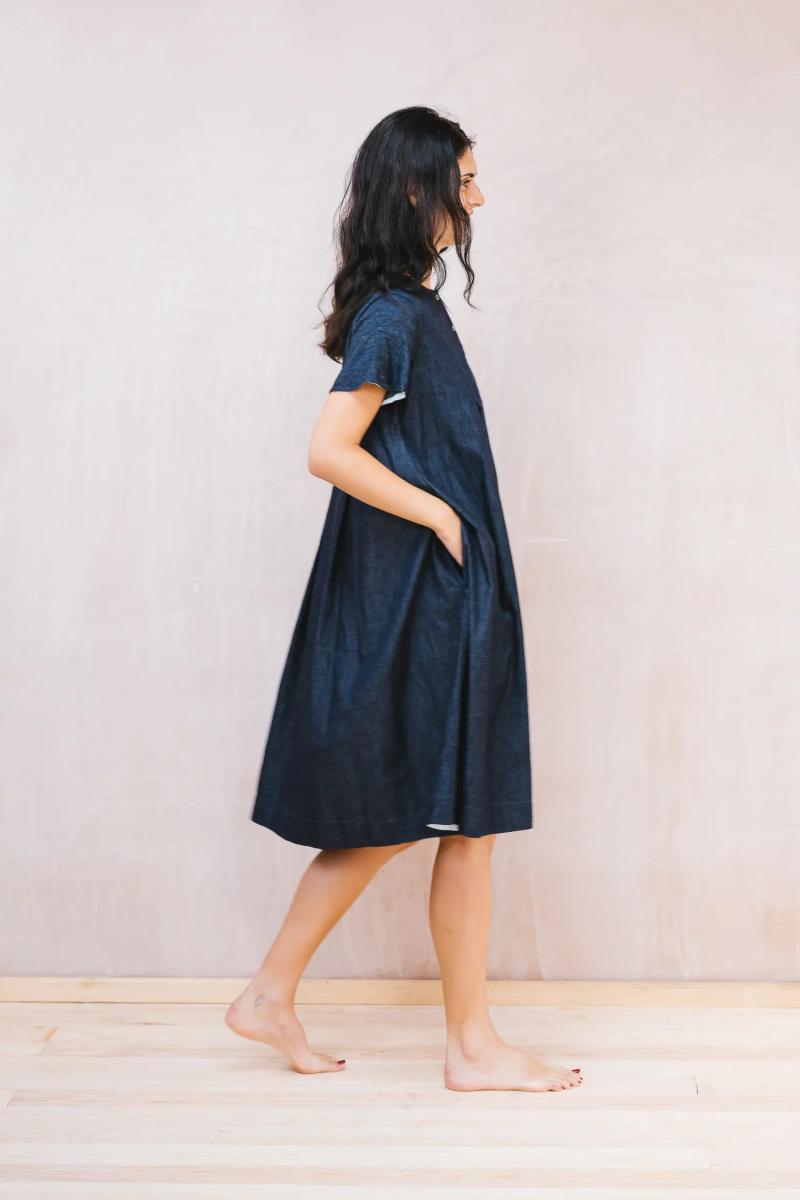 Dolls dress in denim, pleated, falls to the just below the knee, A line shape with two very useful side pockets.