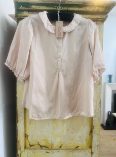 Silk puff sleeve blouse – with a dear little round collar, sleeve are gathered and elasticated – hip length – utterly charming we only have in the silver peony colour as shown in gallery images, its a subtle pale pink, very kind and wearable colour.